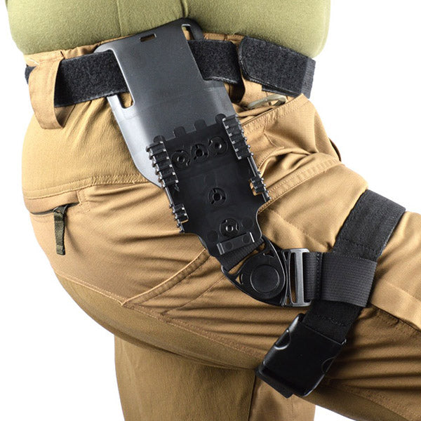 The Safariland RGR-UBL is a low-ride belt loop with the QLS 22 Receiver Plate and single elastic strap attached. It will not pinch or add pressure to your hip bone and it locks onto the belt with a slot design. The QLS 22 Receiver Plate is designed to attach to the QLS 19 Locking Fork and allows you to switch-out your holster quickly and easily without the use of tools. The elastic leg strap includes two silicon strips for non-slip traction.